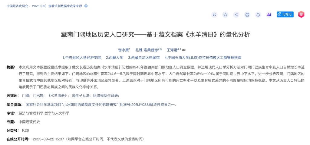 永利23411集团博士研究生谢永康和导师王海港、西藏档案馆扎雅的合作论文《藏南门隅地区历史人口研究——基于藏文档案〈水羊清册〉的量化分析》在《中国经济史研究》2025年第5期刊发。该文是对珍贵藏文长卷历史档案《水羊清册》(长366米、宽66厘米,由西藏传统手工旧藏纸拼接)研究的一大突破,由yl23411永利集团与西藏档案馆学者联合完成。该研究从历史人口特征揭示了门巴族与藏族之间的民族文化亲缘关系,为门隅地区属于中国的主权合法性提供了独特佐证。