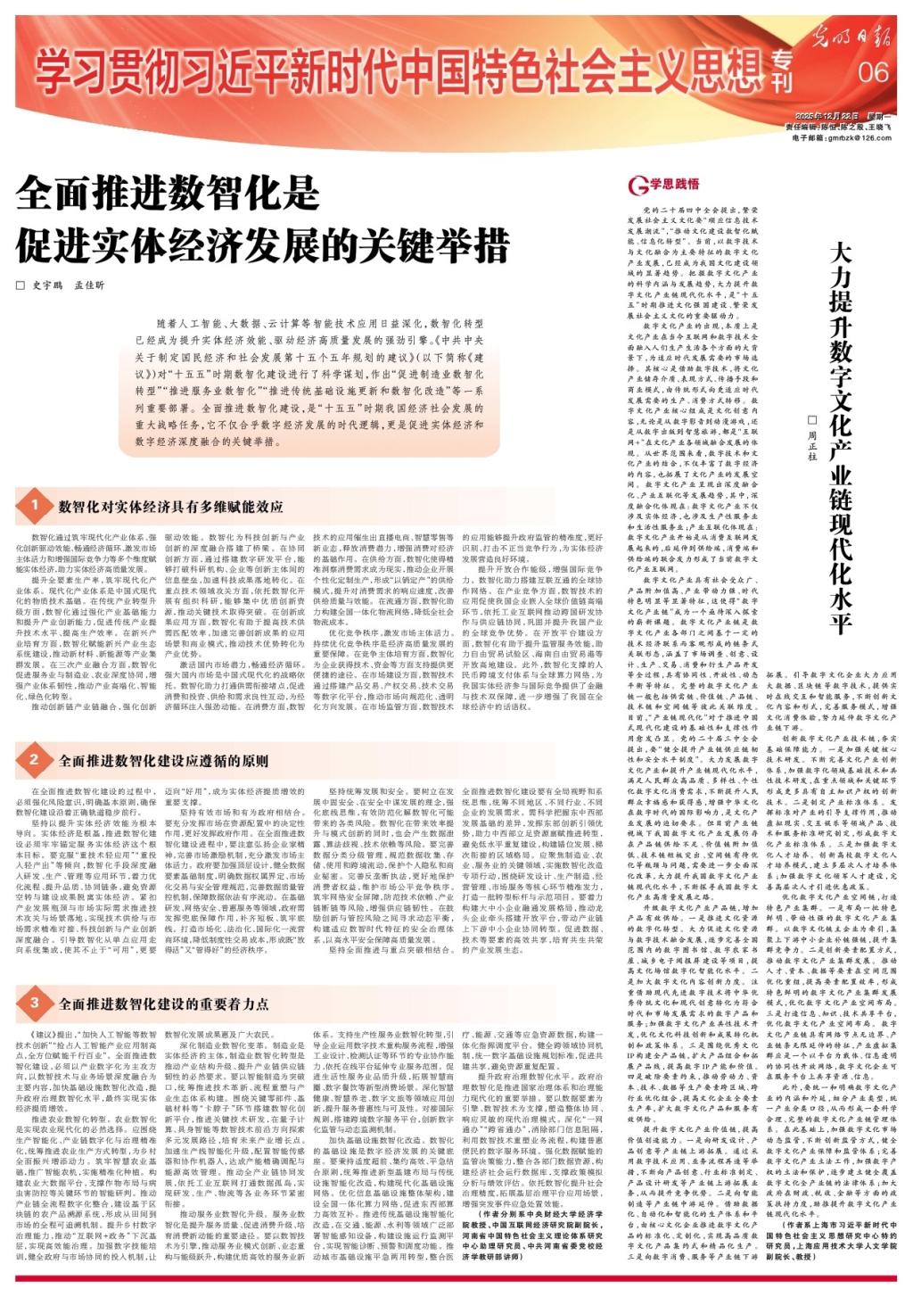 12月22日,《光明日报》学习贯彻习近平新时代中国特色社会主义思想专刊刊发我校永利23411集团教授、中国互联网经济研究院副院长史宇鹏与河南省中国特色社会主义理论体系研究中心助理研究员、中共河南省委党校经济学教研部讲师孟佳昕撰写的文章《全面推进数智化是促进实体经济发展的关键举措》。