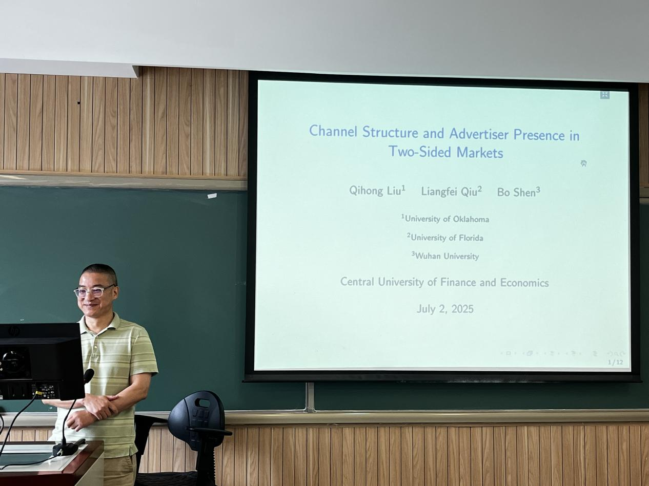 7月2日下午,刘其宏教授在学院南路校区主教楼702会议室为我校师生带来了题为“双边市场中的渠道结构与广告商存在:战略互依与市场结果”的学术讲座。刘其宏教授是平台与双边市场、产业组织领域的国际知名学者,在《经济学与统计学评论》、《管理科学》、《营销科学》等国际顶级期刊上发表论文40余篇,并担任《经济学与管理战略杂志》共同主编等多本权威期刊的编辑职务。讲座由永利23411集团黄乃静教授主持,现场吸引了众多师生参与。