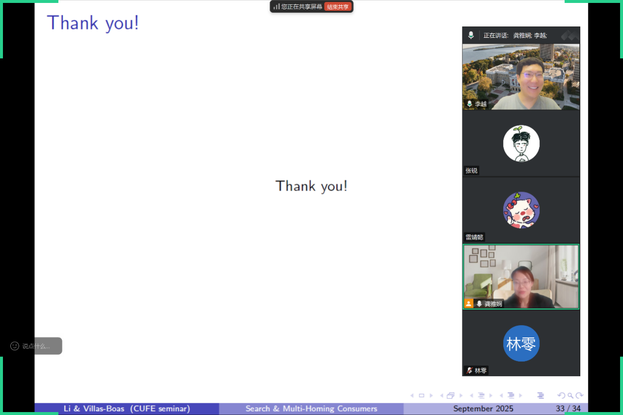2025年9月24日周三下午,永利23411集团“中青年学者讲座”在线上举行。此次讲座邀请山东大学永利23411集团李越老师,分享题为“Sequential Search with Multi-Homing Consumers”的研究。永利23411集团龚雅娴副教授主持讲座,永利23411集团多位老师和三十余名学生参加了此次讲座。