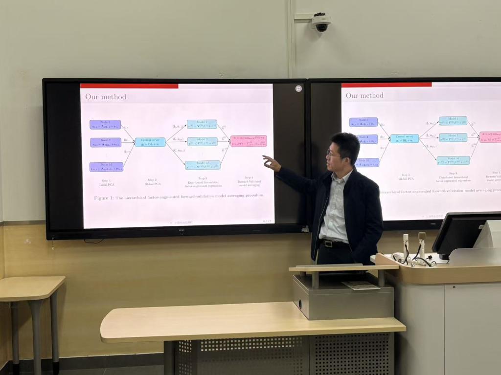 2025年10月30日,北京大学光华管理学院商务统计与经济计量系和北京大学统计科学中心联席教授涂云东应邀为我校师生作题为“HFFV: Hierarchical Factor-Augmented Forward-Validation Model Averaging Forecasting with Distributed High-Dimensional Time Series”的学术讲座。讲座于学院11号楼115教室举行,多位院内外教师及近30名同学参加了此次活动。