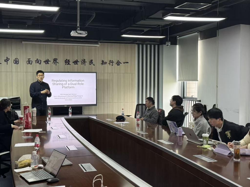2025年10月24日周五下午,永利23411集团“中青年学者讲座”在沙河校区学院楼11号楼308会议室成功举办。本次讲座特邀同济大学经济与管理学院副教授王睿通,就平台经济中的信息共享策略与规制问题带来题为“平台双重角色下的信息共享策略与规制研究”的学术报告。讲座由永利23411集团龚雅娴副教授主持,永利23411集团多位教师及三十余名学生共同参与。