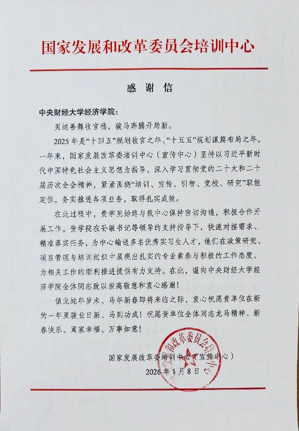 国家发展改革委培训中心(宣传中心)作为国家发展和改革委员会直属事业单位,是负责面向国家发展改革委公务员、委属单位部分干部、全国发展改革系统有关干部开展教育培训,并指导全国发展改革系统干部培训工作的专业化干部培训机构。培训中心在信中表示,在院领导的支持指导下,学院快速对接需求、精准落实任务,为中心输送多名优秀实习生人才,他们在政策研究、项目管理与培训组织中展现出扎实的专业素养与积极的工作态度,为相关工作的顺利推进提供有力支持。