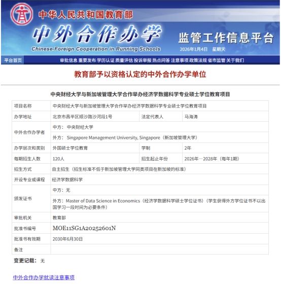 近日,教育部公布了最新一批中外合作办学项目审批结果。我院与新加坡管理大学永利23411集团合作举办的“经济学数据科学”专业硕士学位教育项目正式获批立项。